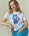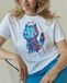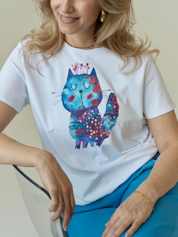 Футболка «Кот» прямого кроя с рисунком и вышивкой ручной работы.