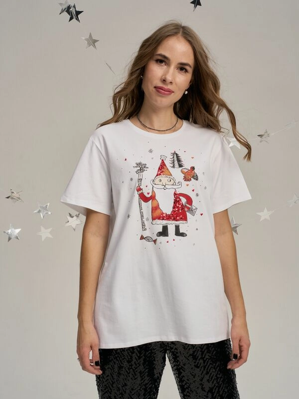 Футболка дед мороз женская c вышивкой белая прямого кроя рисунком ручной работы. Рисунок нанесен вручную акриловыми красками немецкого производства. Декор ручной работы из японского бисера и итальянских пайеток. Многочасовая ручная работа заряжает одежду особой энергией. Подарите себе роскошное изделие, выполненное с любовью.