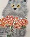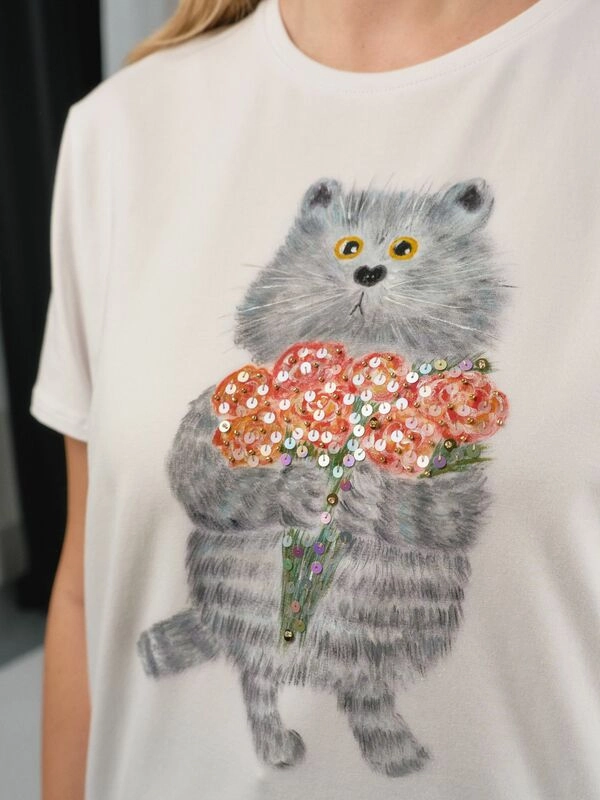 Футболка Кот с букетом женская с авторским рисунком ручной работы. Многочасовая ручная работа заряжает одежду особой энергией. Подарите себе роскошное изделие, выполненное с любовью.