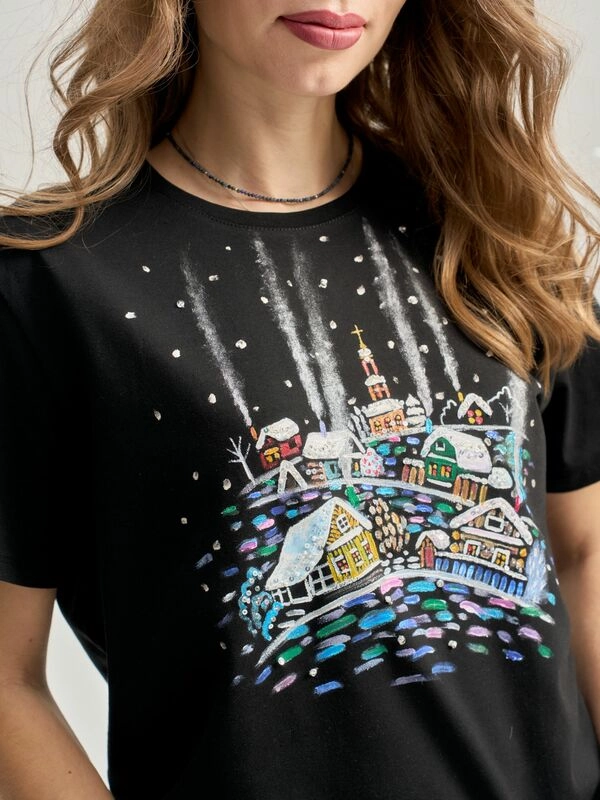Футболка Ночь перед рождеством прямого кроя с рисунком и вышивкой ручной работы. Авторская роспись ручной работы.