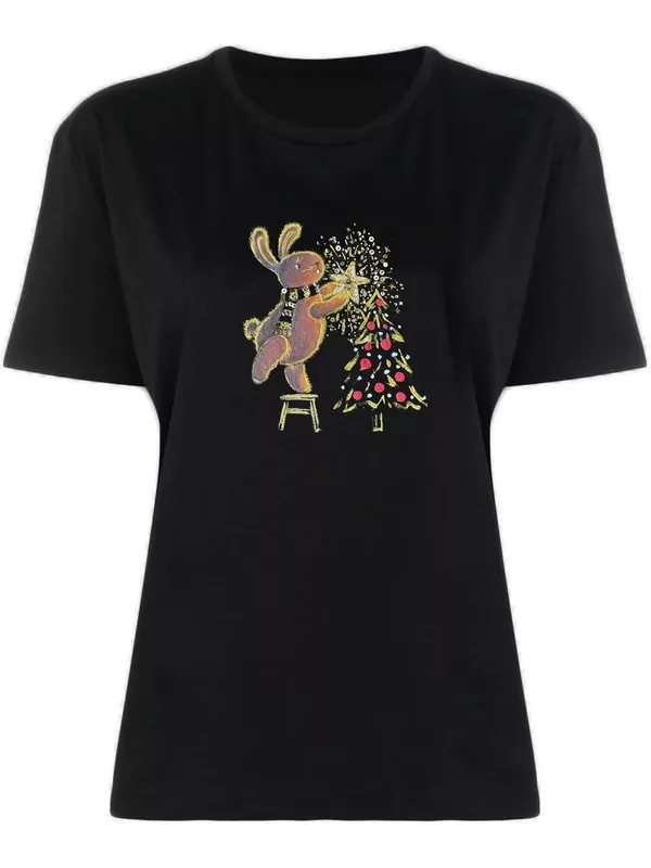 Футболка Новогодний зайка прямого кроя с росписью и вышивкой ручной работы. Авторский эскиз.