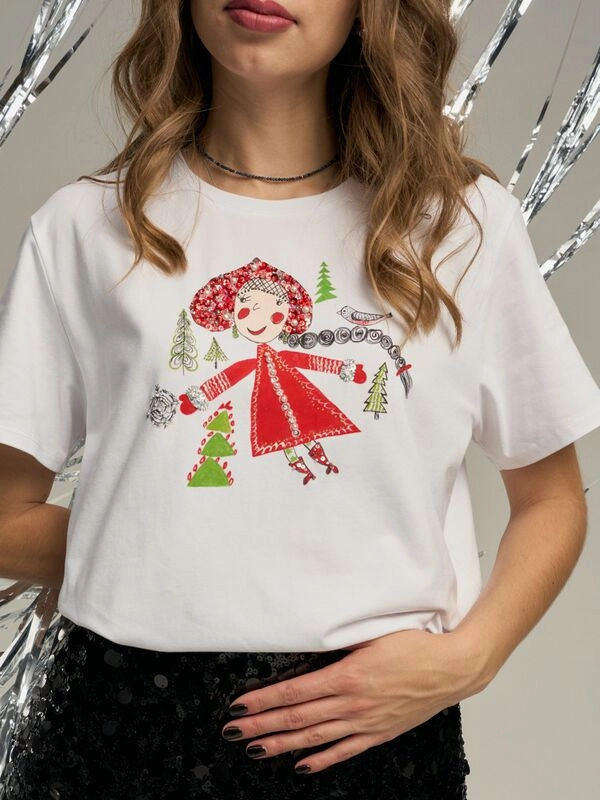 Футболка Снегурочка женская с вышивкой прямого кроя и рисунком ручной работы. Декор ручной работы из японского бисера, итальянских пайеток. Многочасовая ручная работа заряжает одежду особой энергией. Подарите себе роскошное изделие, выполненное с любовью.