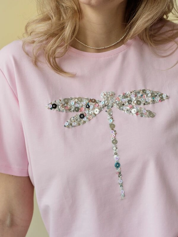 Футболка Стрекоза женская прямого кроя с вышивкой ручной работы. Оттенок нежно-розовый в стиле Барби.