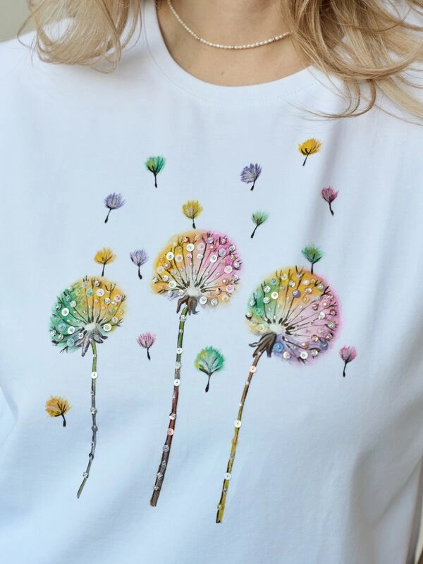 Футболка Одуванчики женская с вышивкой прямого кроя с рисунком ручной работы.