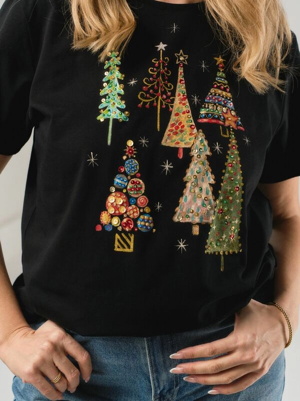 Футболка новогодними ёлки чернаяс росписью и вышивкой