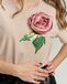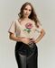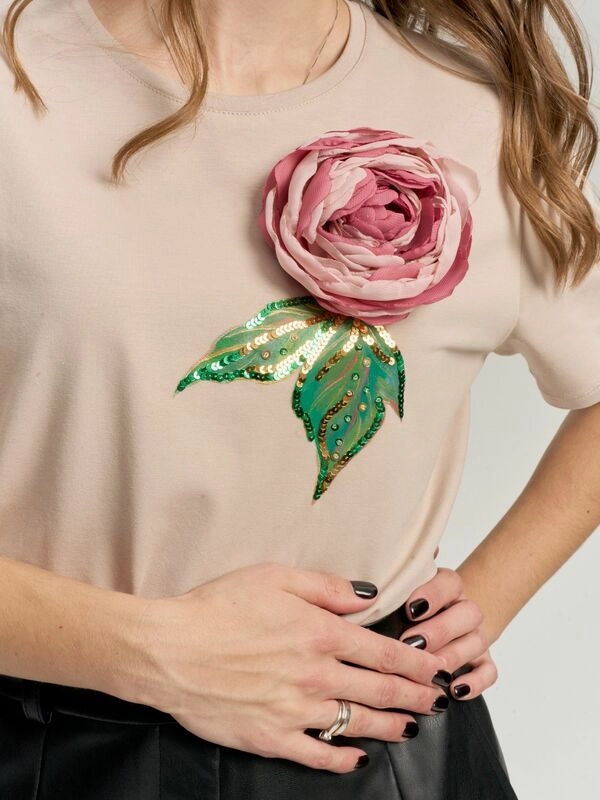 Футболка бежевая в оттенке какао прямого кроя с объемным цветком из итальянского шифона.