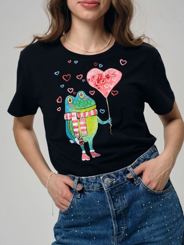 Футболка Влюбленный жабёнок женская прямого кроя с росписью и вышивкой ручной работы. Авторский эскиз. Роспись ручной работы.
