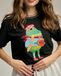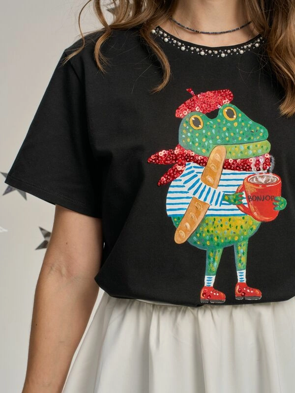 Футболка Жабёнок с багетом женская прямого кроя с росписью и вышивкой ручной работы. Дизайн завершает вышивка жемчугом и японским ювелирным бисером на передней части горловины, отсылая к стилю француженок. Авторский эскиз. Роспись и вышивка ручной работы.