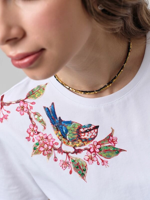 Футболка с птичкойс росписью и вышивкой