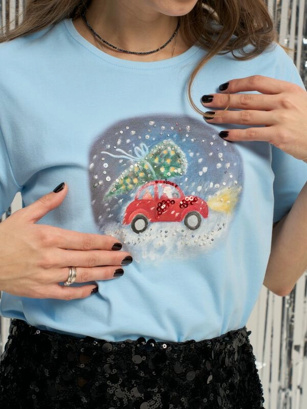 Футболка небесная Новый годС принтом и вышивкой