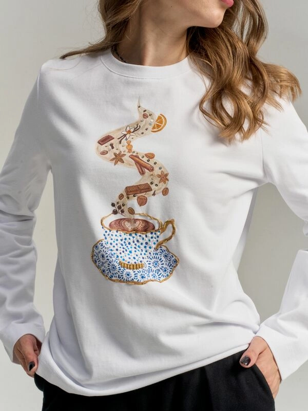 Лонгслив женский прямого кроя с росписью и вышивкой ручной работы. Премиальный плотный хлопок с бархатистым peach-эффектом.