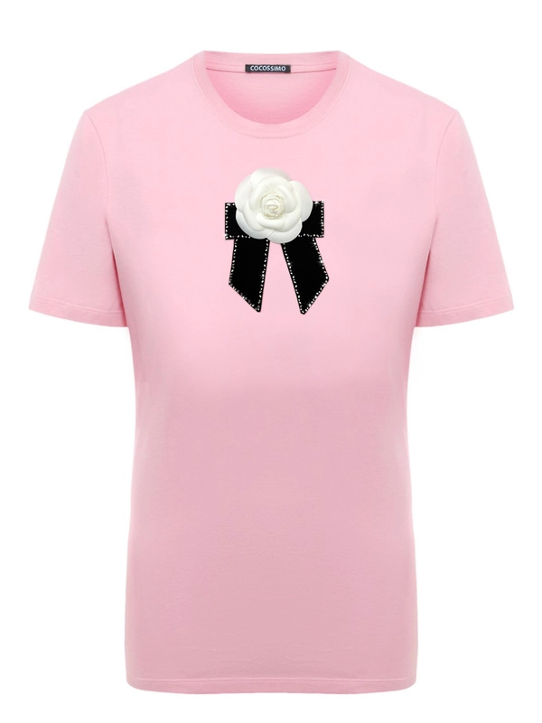 Розовая футболка с камелией в стиле Chanelс брошью