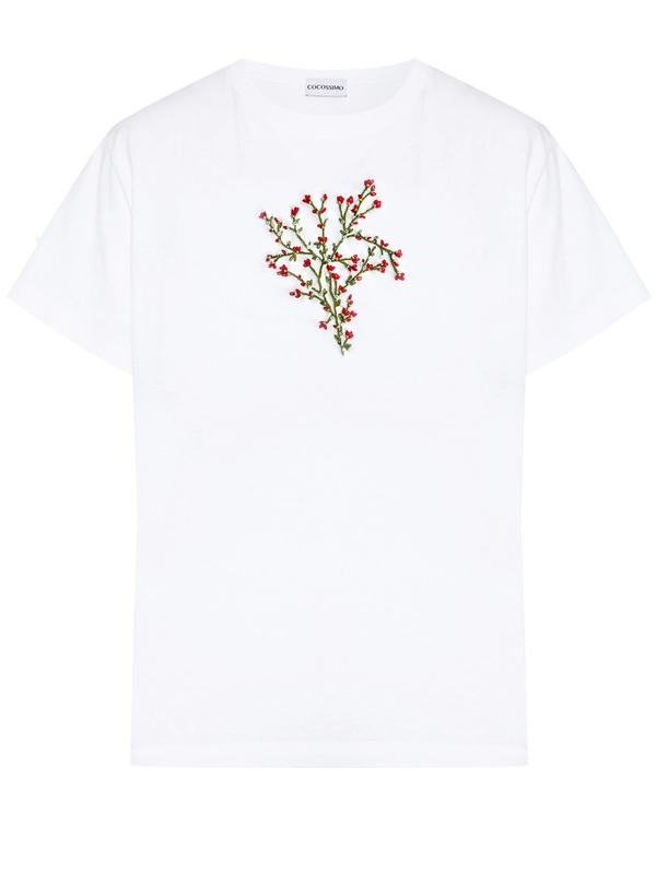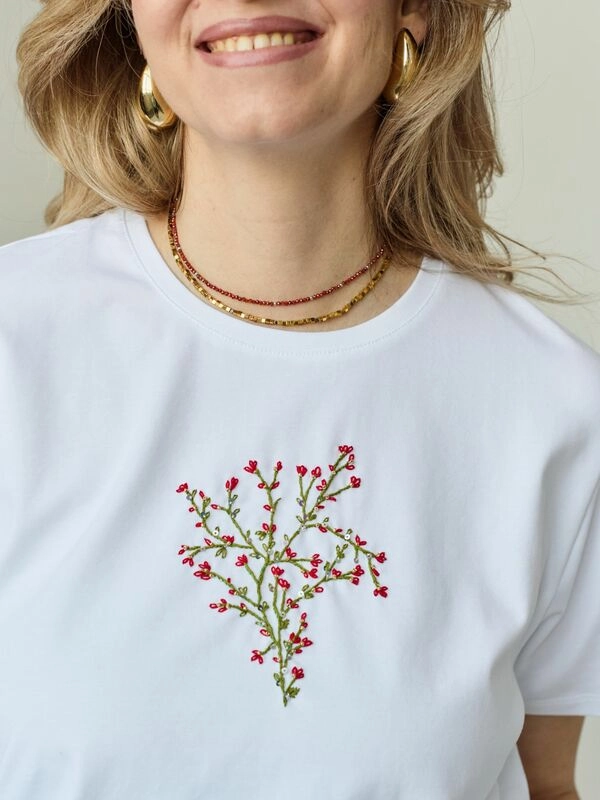 Футболка с вышивкой мулине, украшенная японским бисером и итальянскими пайетками.