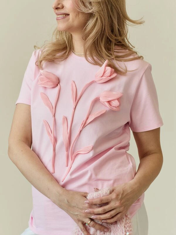 Футболка розовая с тюльпанамис объемными цветами