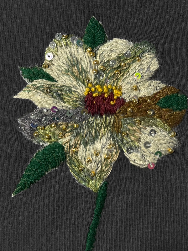 Футболка с вышивкой мулине в стиле Oscar de la Renta, украшенная японским бисером и итальянскими пайетками.